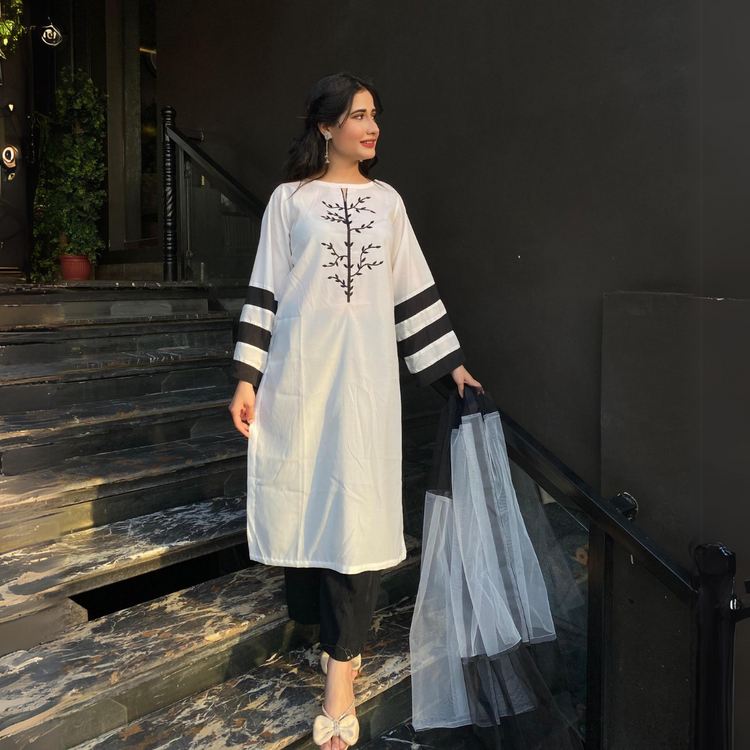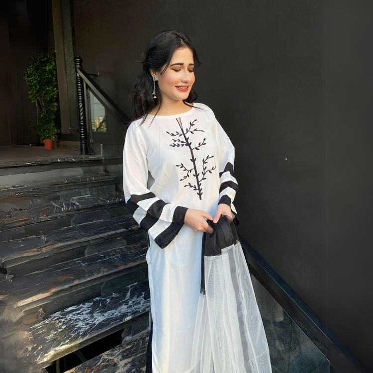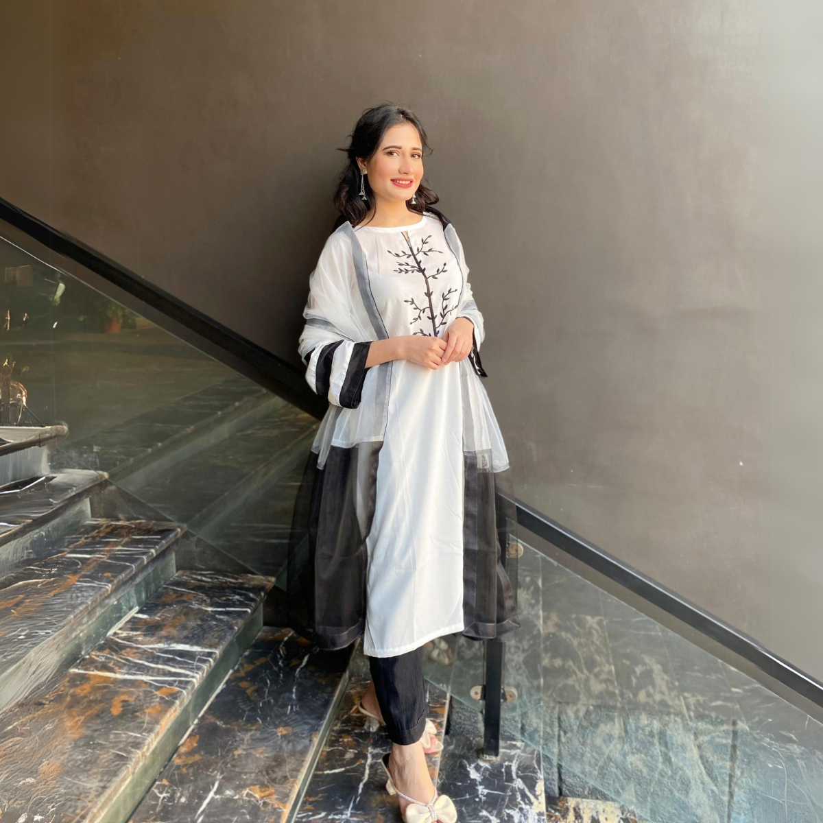 "Introducing our dazzling 'Diamond White' Georgette Ladies Suit, a mesmerizing ensemble designed to ignite every occasion with unparalleled elegance and charm. Handcrafted to perfection, this ensemble is tailored for the modern woman who craves sophistication and allure. Here's why it's a must-have: