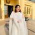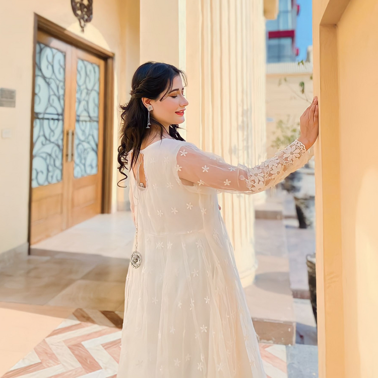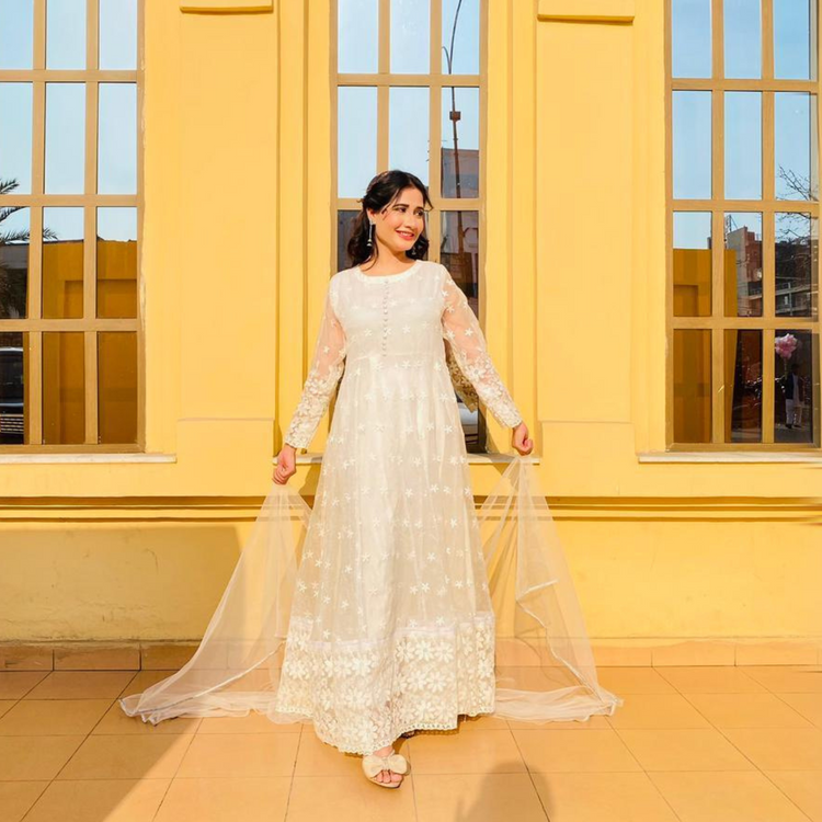 Snowflake is full-length kalidaar peshwas. The maysuri bodice is elegantly embroidered work ending in loosely tied tassels. The front neck are lightly embroidered and add buttons . The kaliyaan are made with shimmery net fabric. The daman is finished off wth white laces. The dress comes with a built-in slip and dupatta with chan embroidery and gota at pallu.
