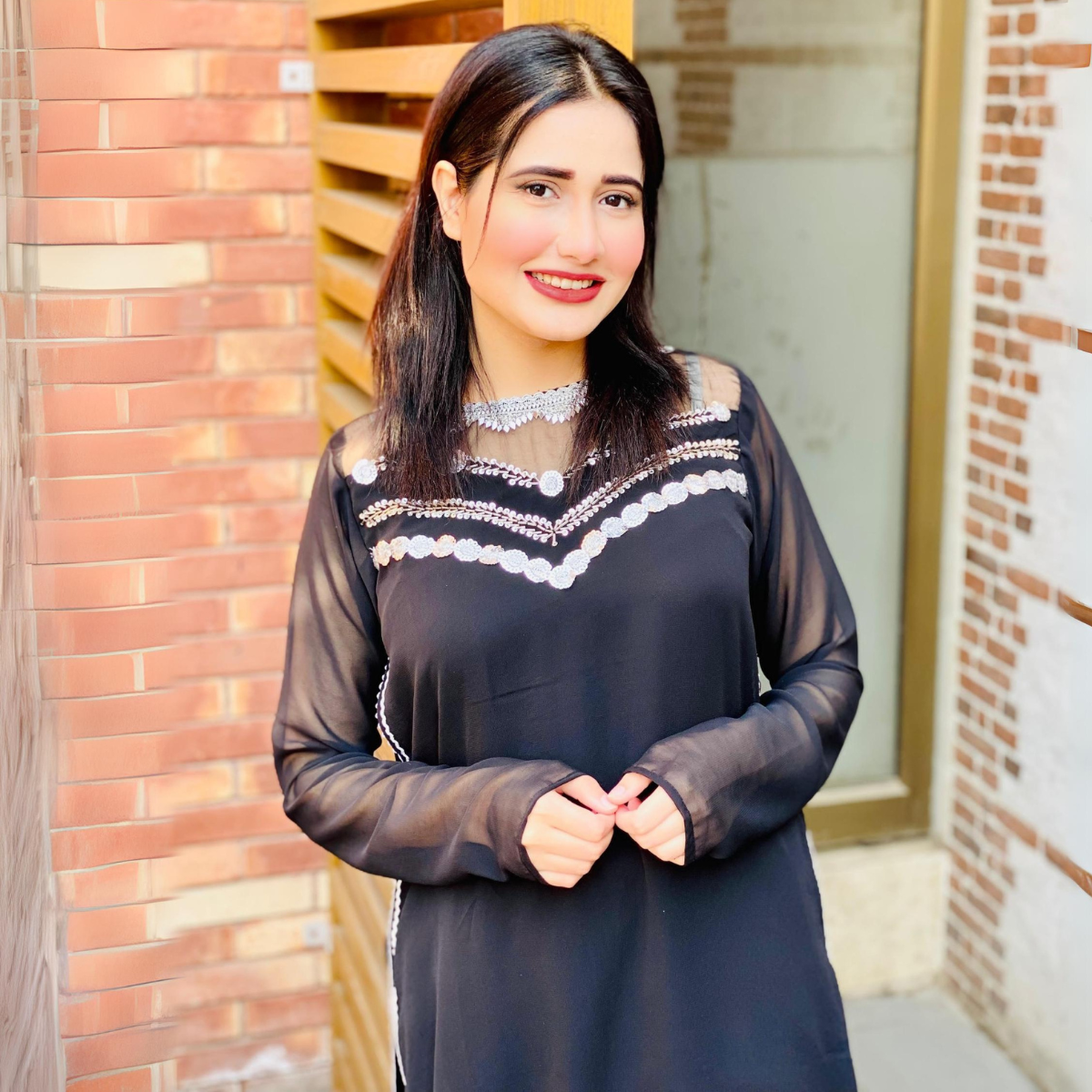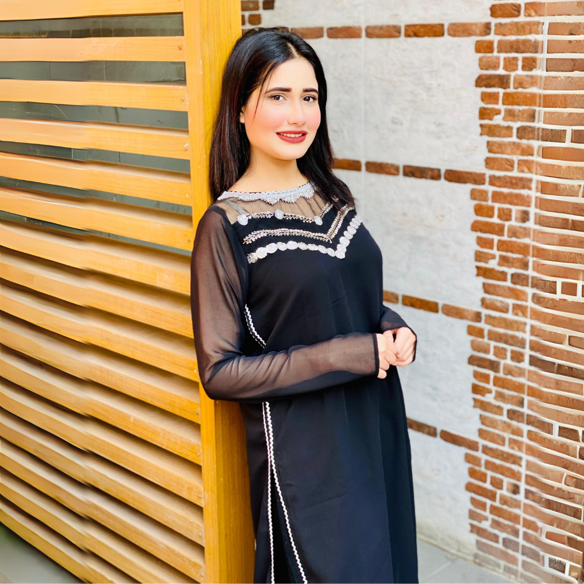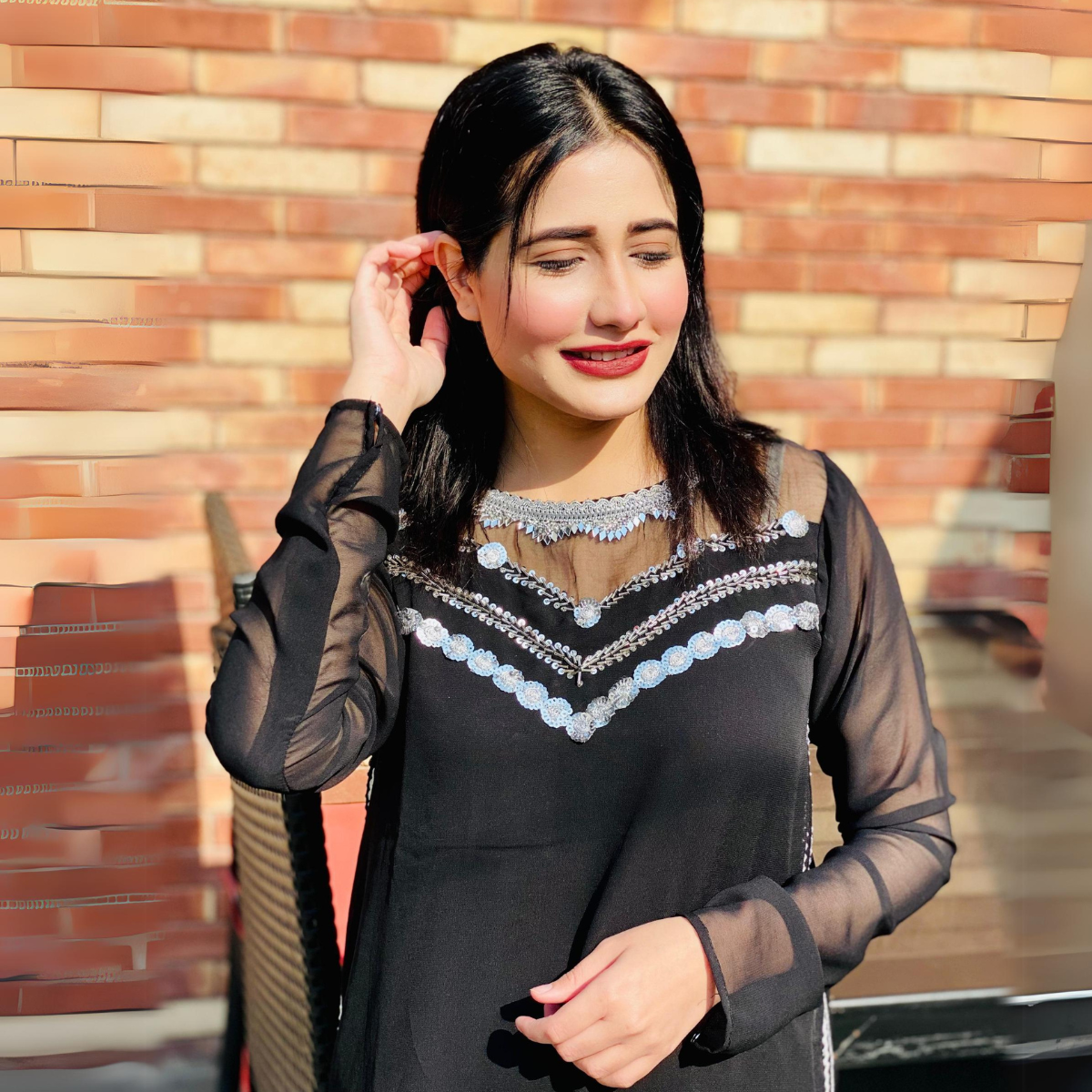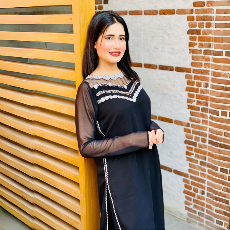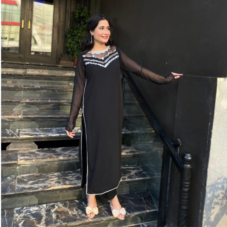 Zuri is a festive Chiffon dress, the neckline has mughal inspired zari and sequins embroidery with laces.The outfit comes with a Same Trouser. This ensemble combines the luxurious feel of black chiffon with intricate detailing to create a captivating and elegant look.