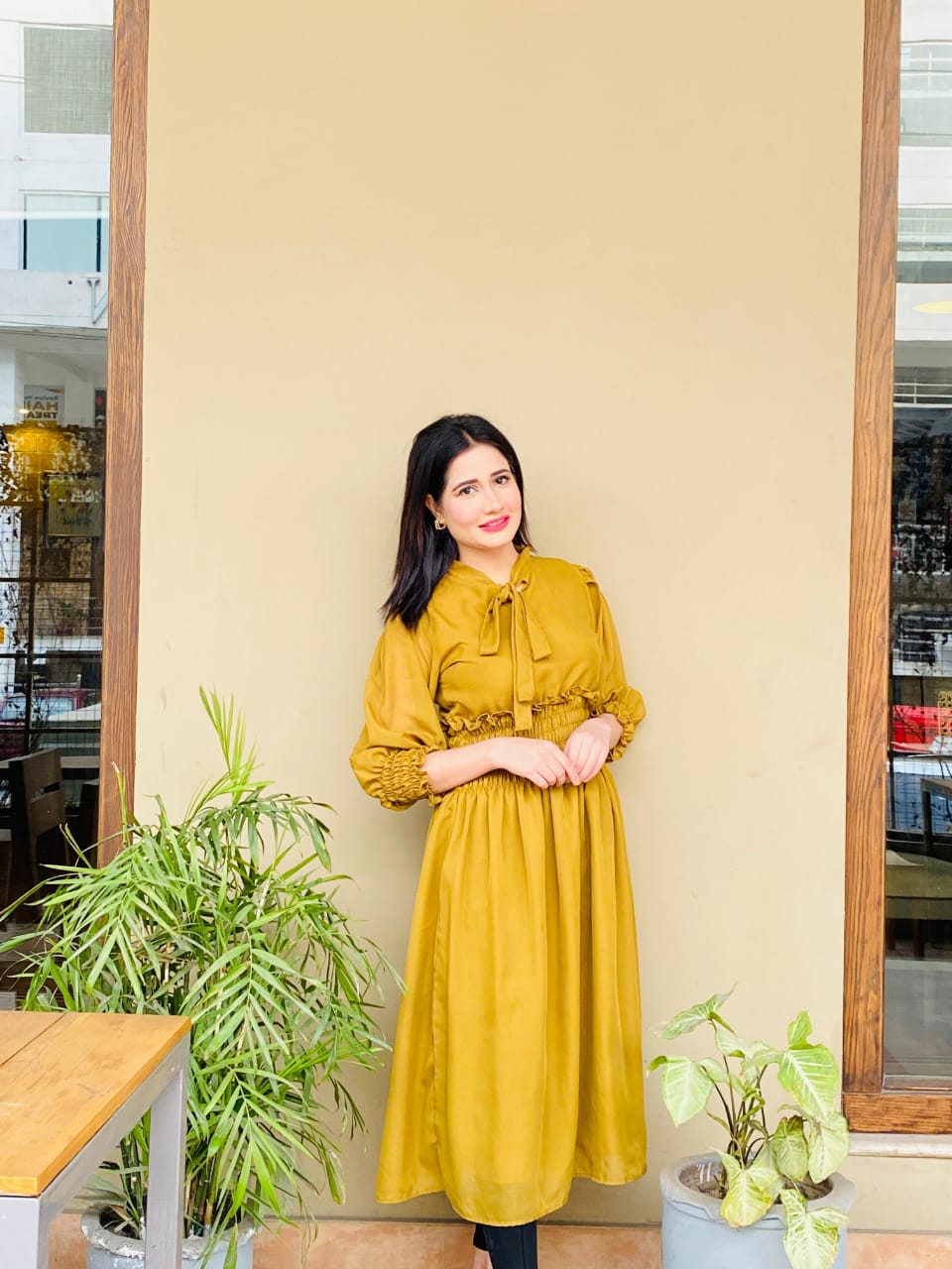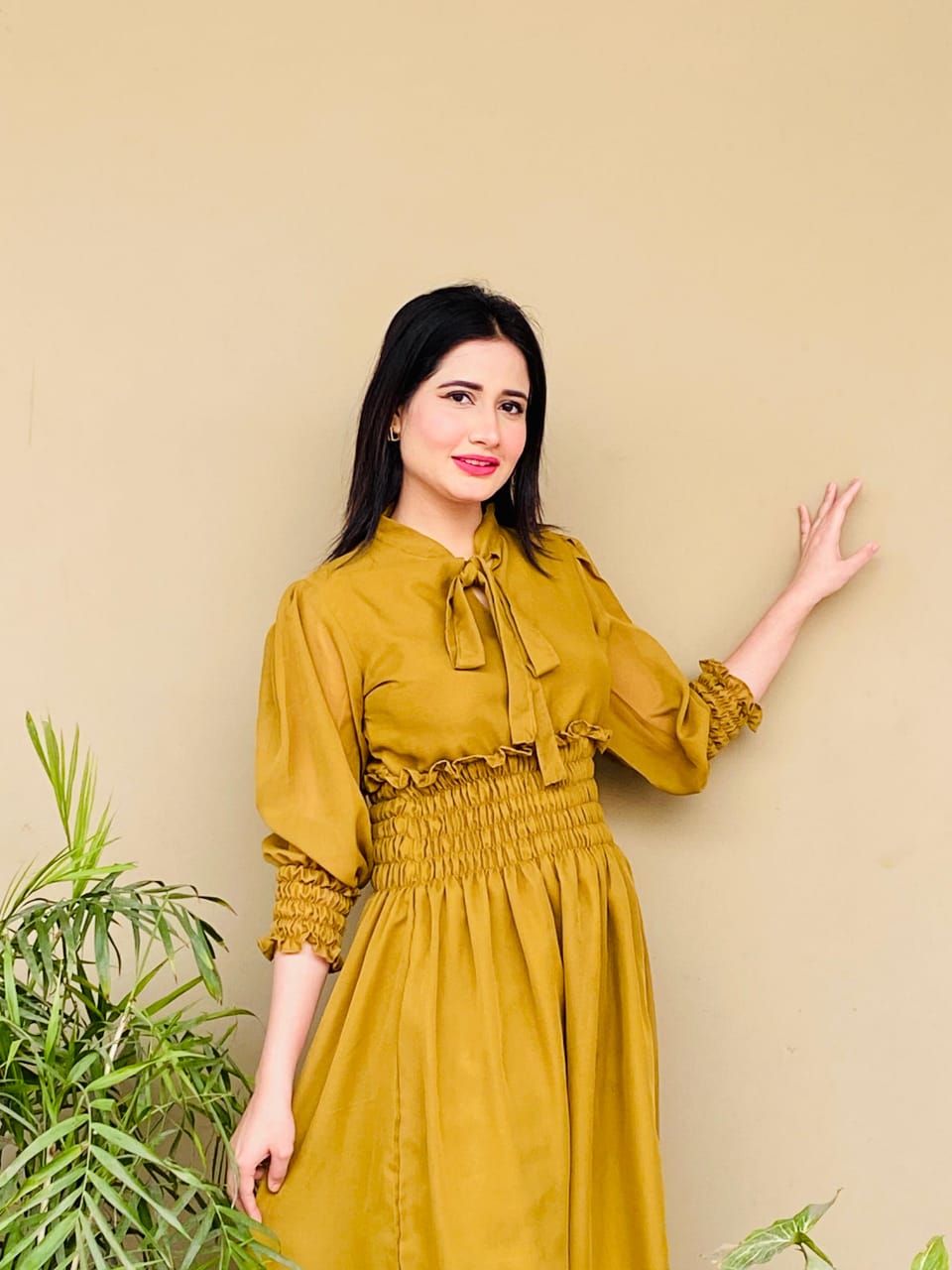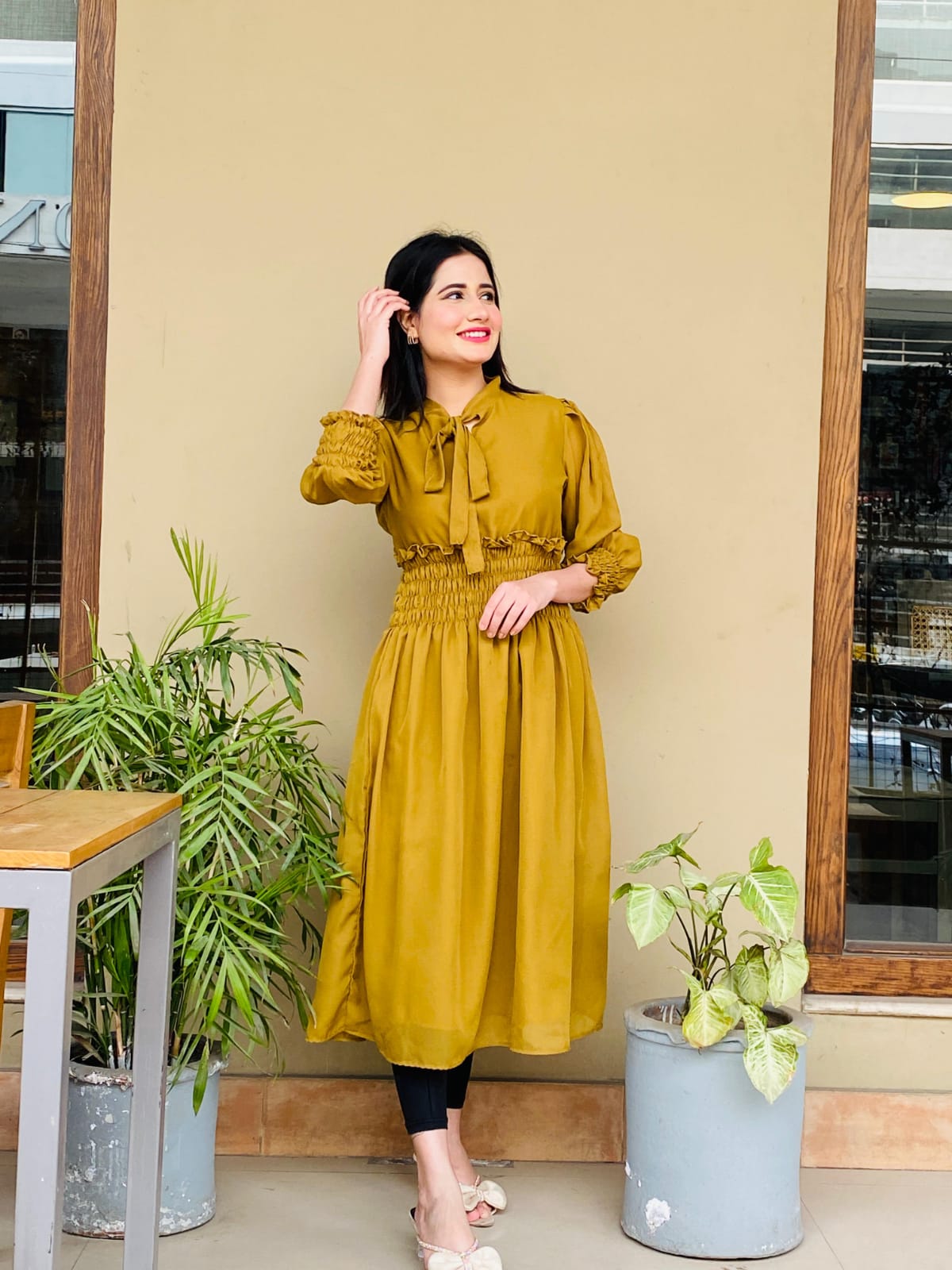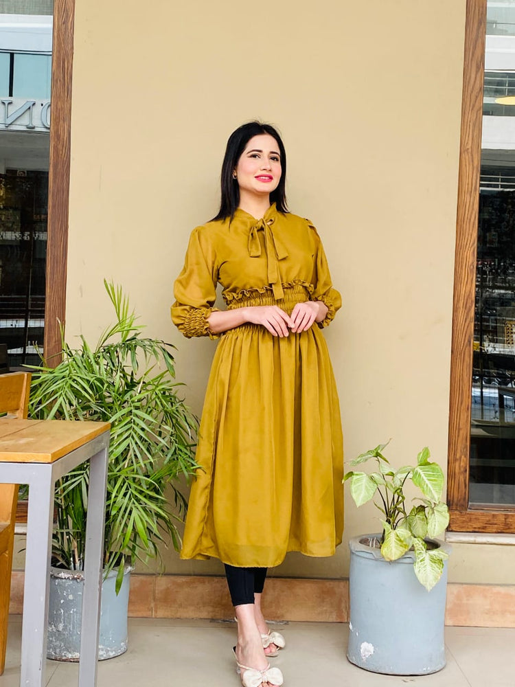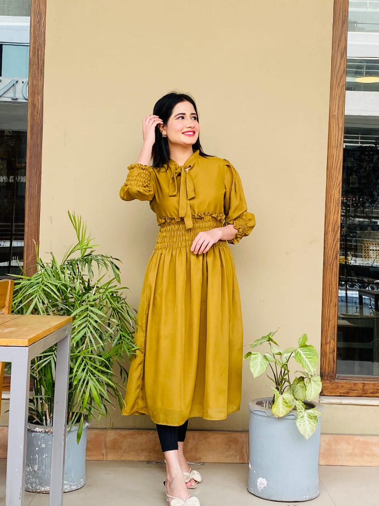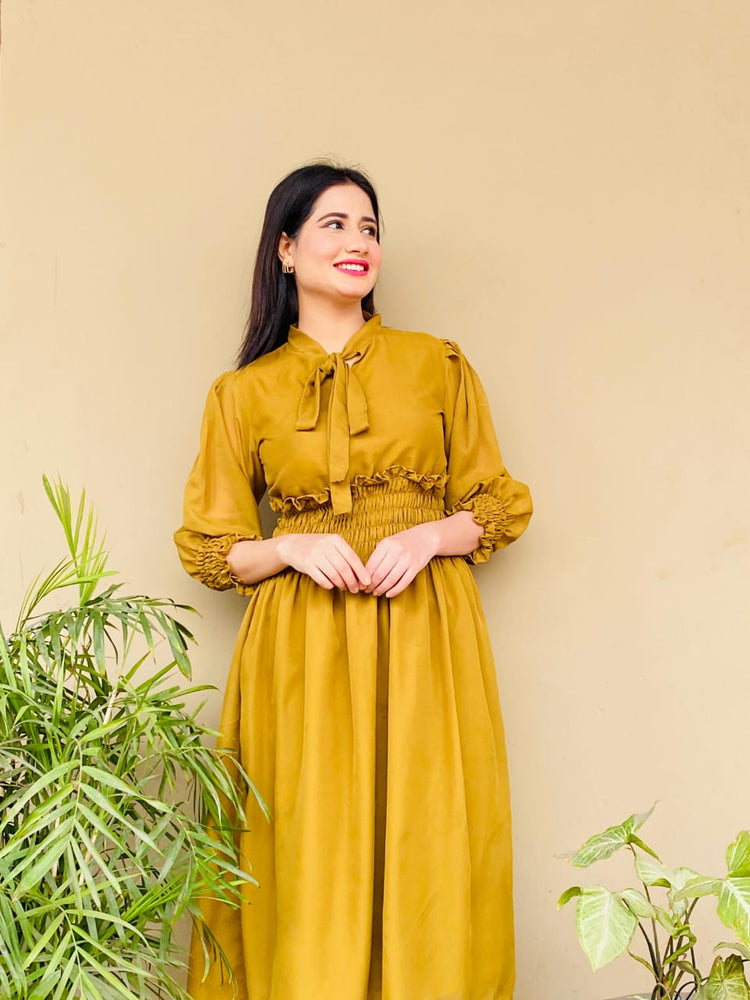 Unleash the allure of retro elegance with this captivating golden long dress. Its cheeky bodice round neckline adds a flirtatious touch, while the Chiffon fabric exudes timeless charm. Cascading to ankle length, the dress boasts full ilasted sleeves that bring a voluminous and dynamic flair.