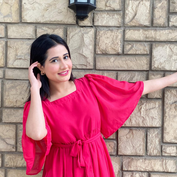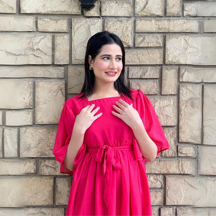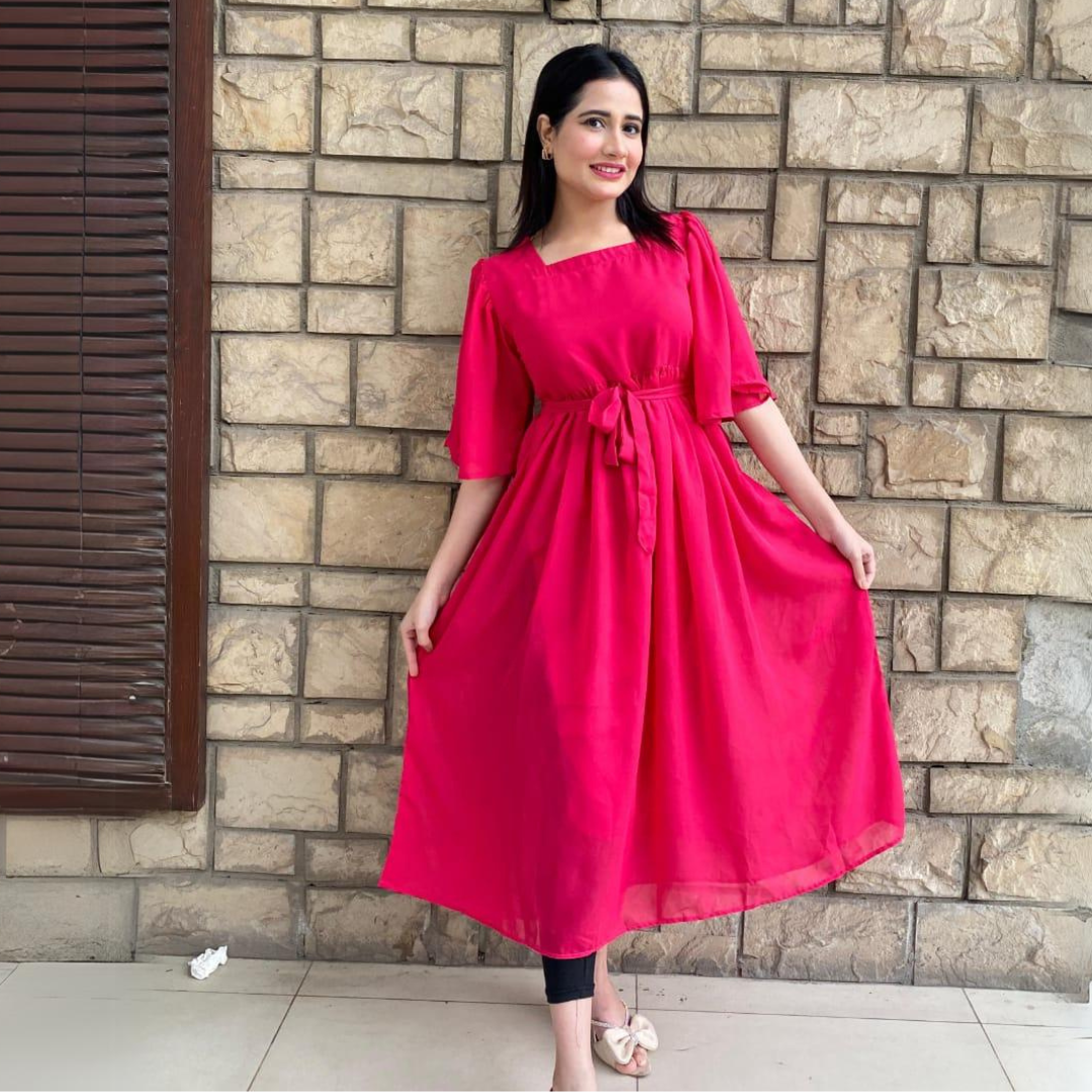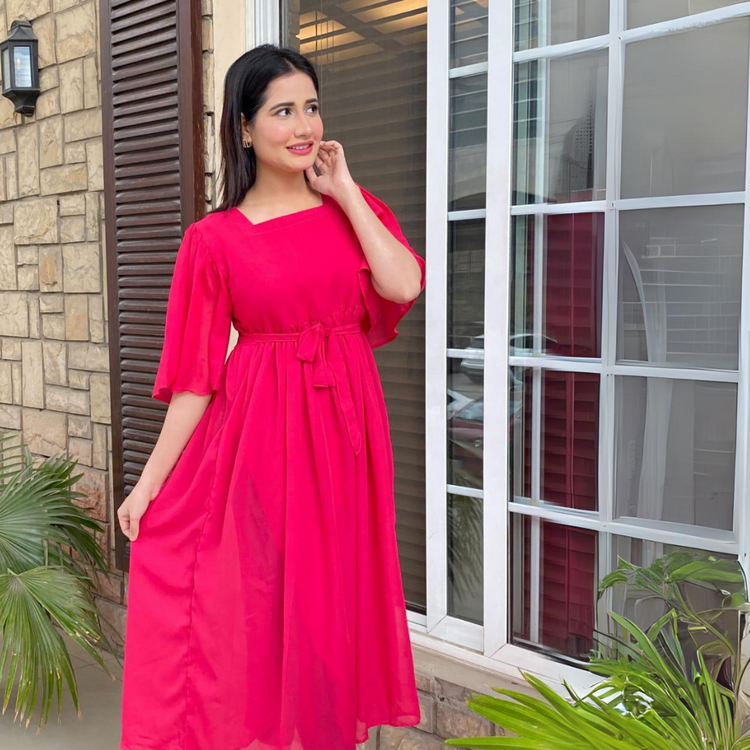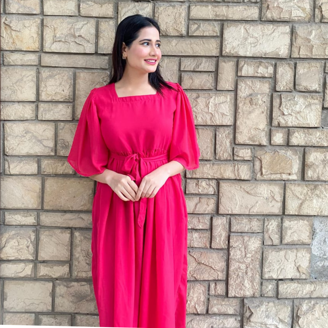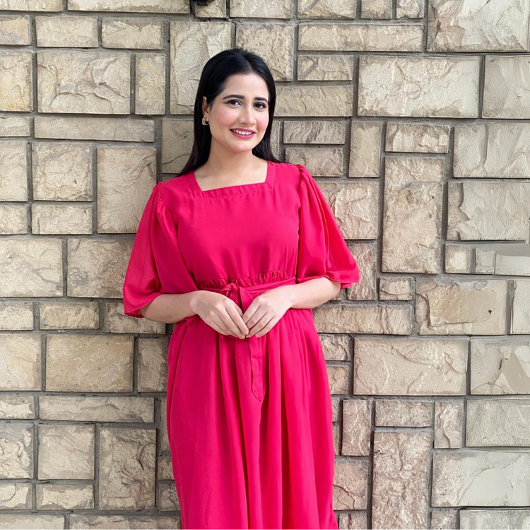 Florence is a high flared dress in fuchsia pink. having ruffled details on the bodice falling till shoulders having basic sheer sleeves. It has tie up belt at the back.