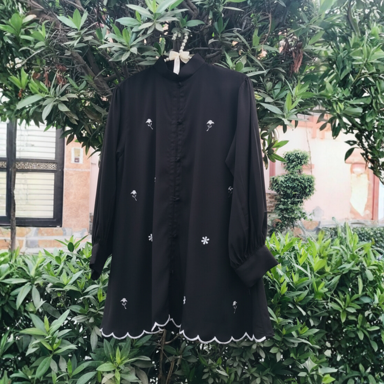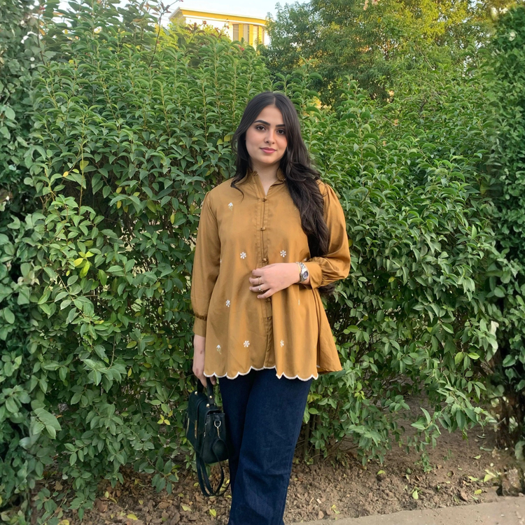 Chic terracotta Georgette top featuring delicate daisy embroidery, a mandarin collar, and a unique scalloped hem. Comfortable and stylish for versatile wear.