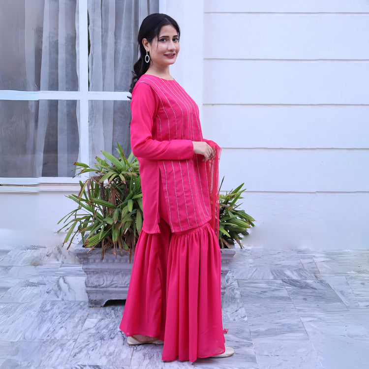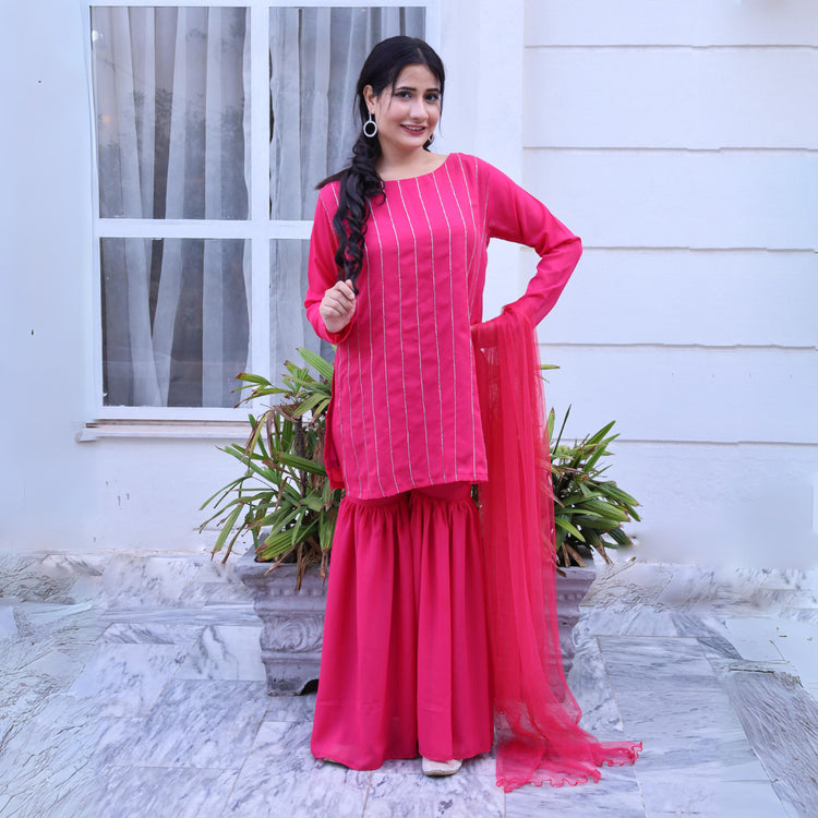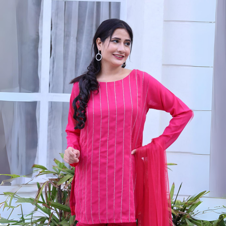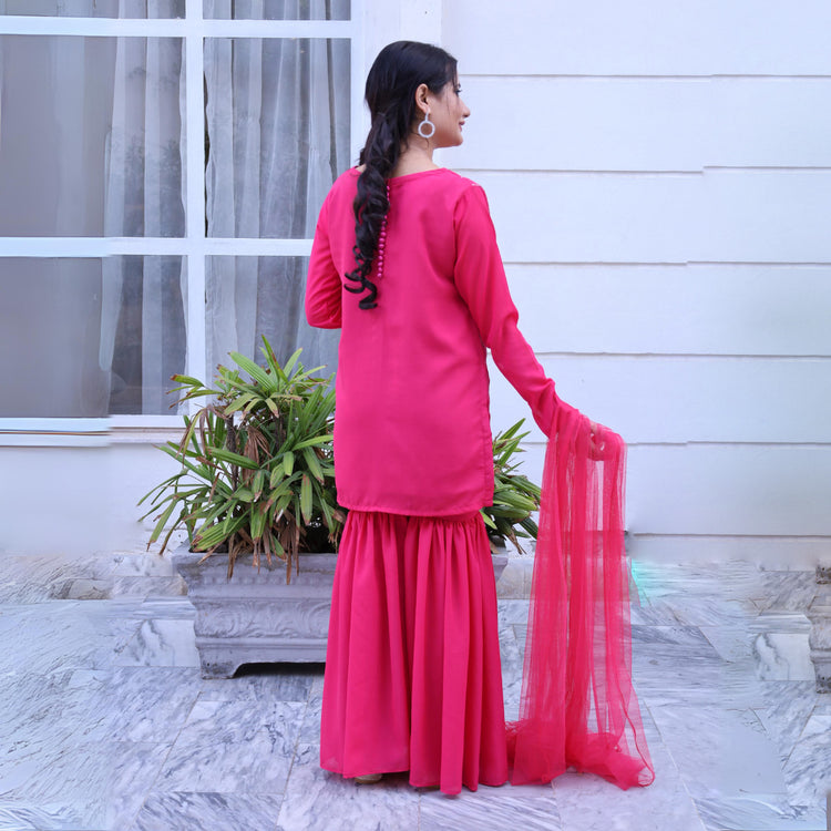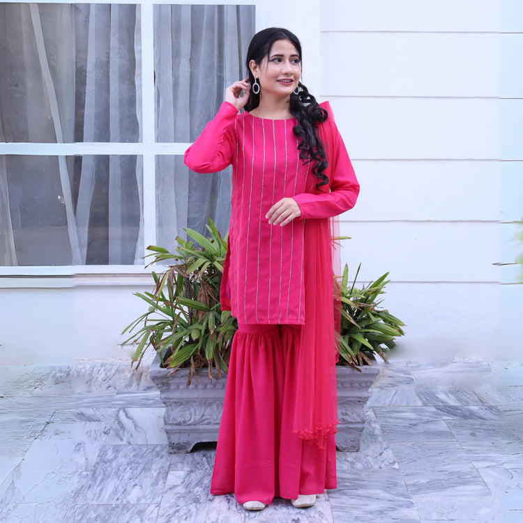 Our latest product that’s name is Hussun e jana our this amazing product in which shirt is made with a smooth fabric and we use Dori in front of shirt to make the look worthy and at the back we use punch button made with fabric to close the shirt with a ehancing look and here down we have a grara /trouser design like grara the trouser also made like the shirt fabric and we have a dupatta made with net all these combinations make the product....
