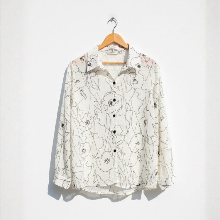 This lightweight and airy sheer blouse features a striking black and white outline floral print (line art print). Designed with a classic collar and full button-down front (with contrasting black buttons), this shirt offers a chic, artistic, and versatile style.