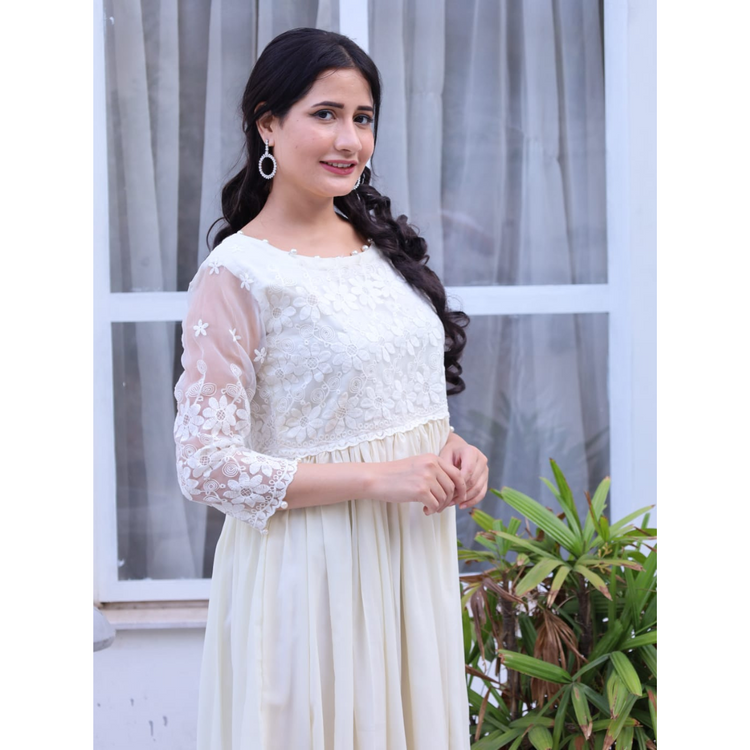 Introducing our new dress Snow Petal which is a frock that is made with a rare fabric on top York is made up with organza net and York fabric is so comfortable to wear and we use stones on neck to give you a massive look. after wearing !Sleeves also made with organza net and the size of sleeves is little bit short than full and the end of sleeves we use pearls to enhance the York look and flare is made with a beautiful chiffon that is wide and feel easy to walk